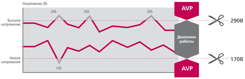 Новая технология автоматической защиты системы от скачков напряжения AVP (Auto Voltage Protection), позволяет защитить узлы кондиционера от перепадов напряжения в электрической сети в диапазоне 170 ~290В*